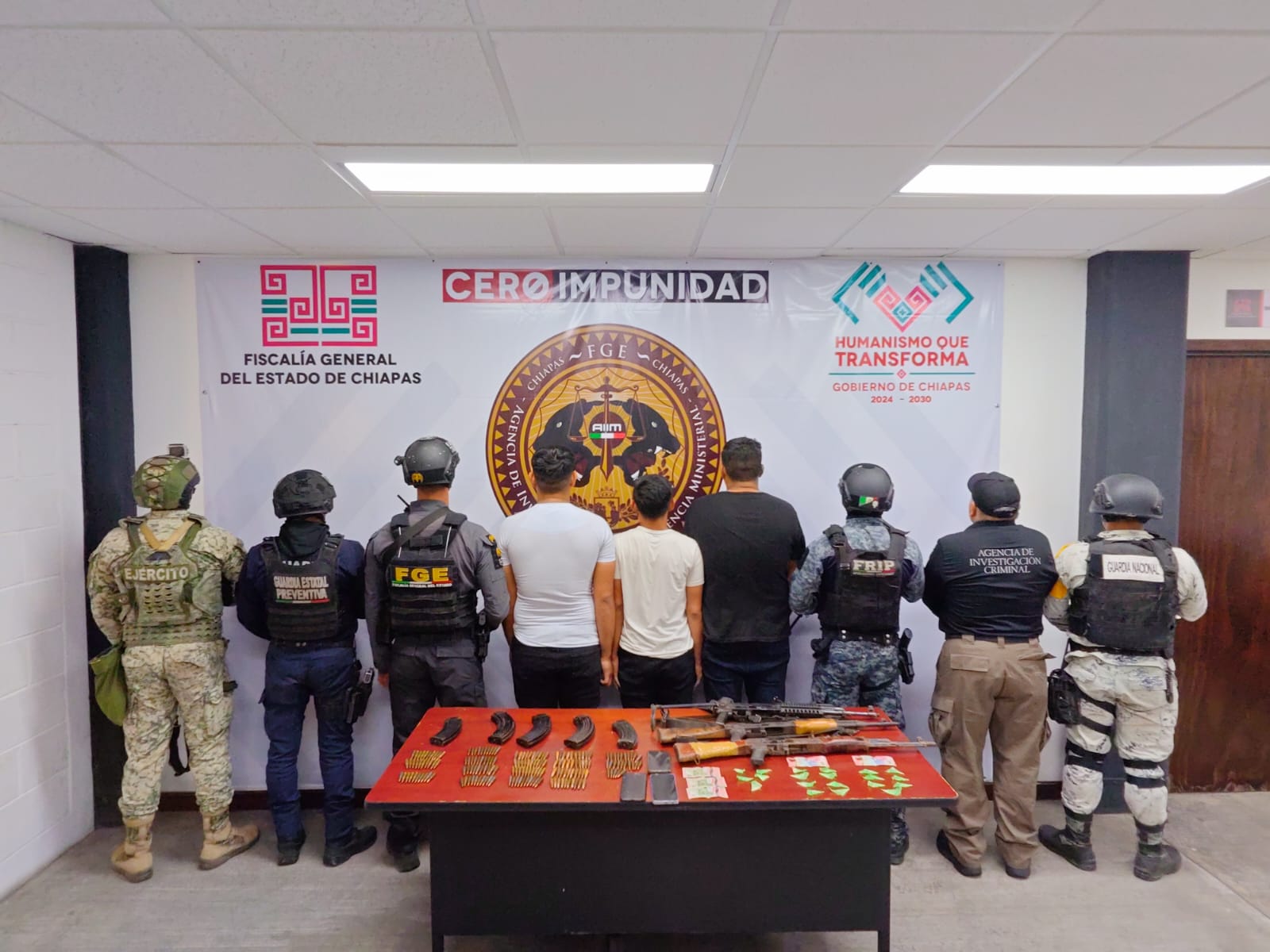 Elementos de la Guardia Nacional detuvieron a tres personas en posesión de armas de alto poder y presunta droga en las inmediaciones del panteón municipal de Arriaga, como parte de las acciones coordinadas de seguridad en la entidad.
