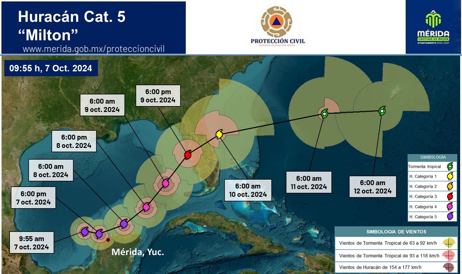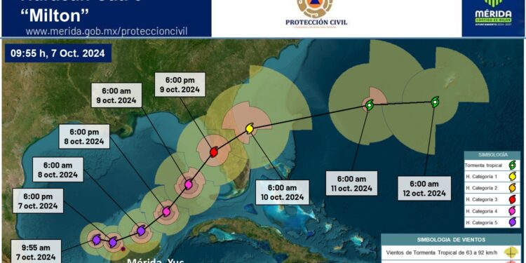 Este lunes, el huracán Milton se intensificó a categoría 5, alcanzando vientos sostenidos de 250 km/h. En respuesta, la Protección Civil de Yucatán decretó Alerta Naranja para los municipios del centro, norte, noreste, noroeste y oeste del estado. El gobernador Joaquín Díaz Mena anunció la suspensión de actividades no prioritarias, y se suspendieron las clases en 50 de los 106 municipios de Yucatán.